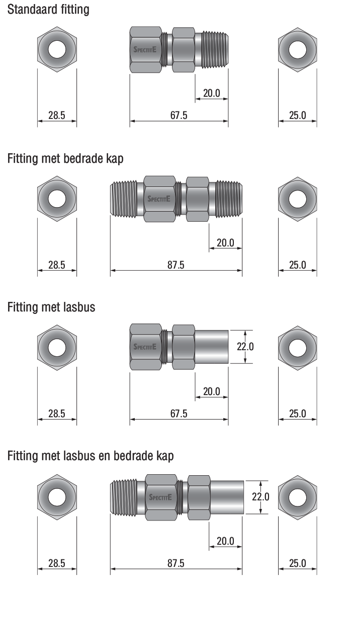 Er zijn vier afmetingen van de fitting, namelijk 1/8”, 1/4”, 1/2“ en 3/4“ processchroefdraadverbindingen met BSPT (conisch gas of DIN 2999 `R') en NPT schroefdraad.